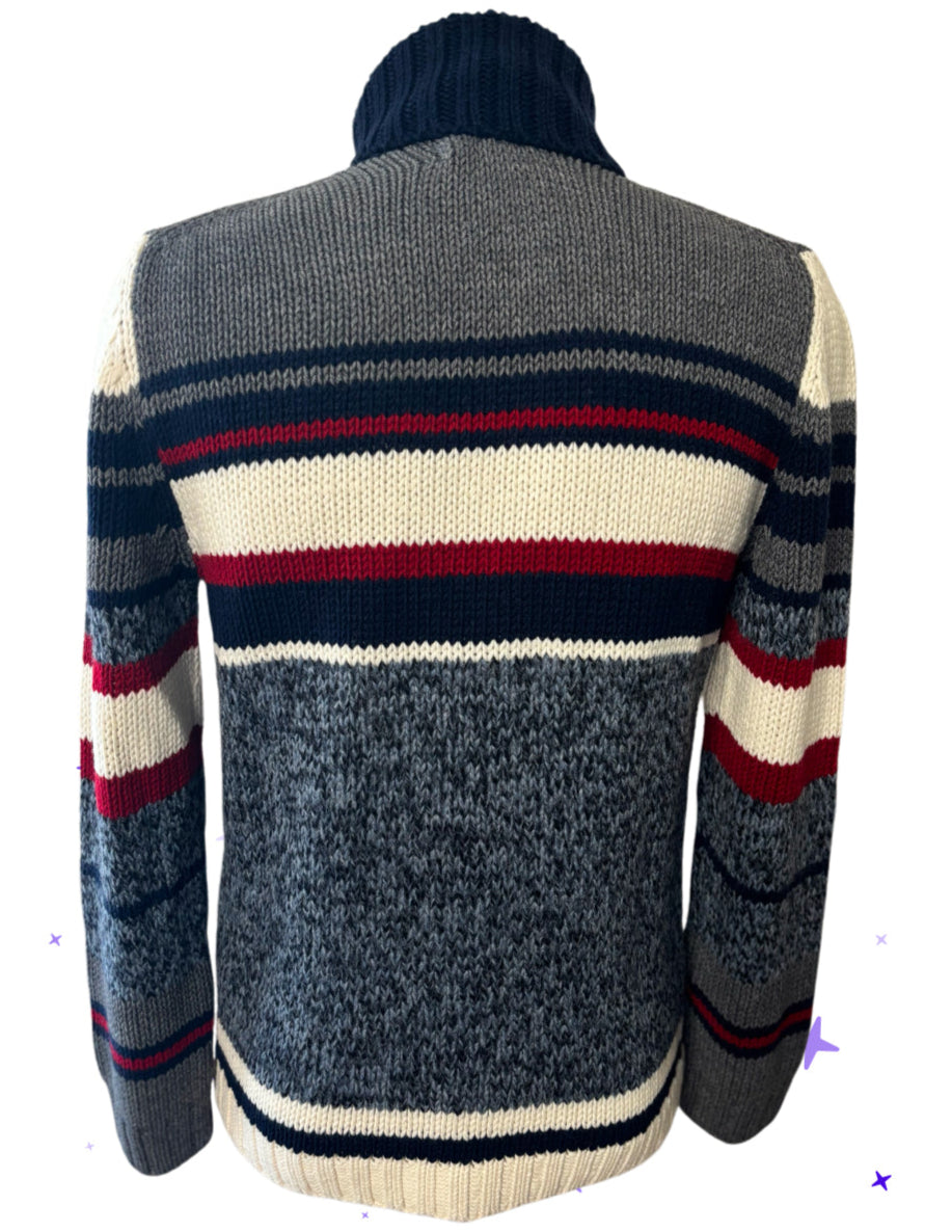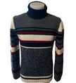 OBVIOUS maglia collo alto in misto lana a manica lunga. Fantasia rigata con colori a contrasto. Collo alto, polsini ed elastico al fondo a costine.