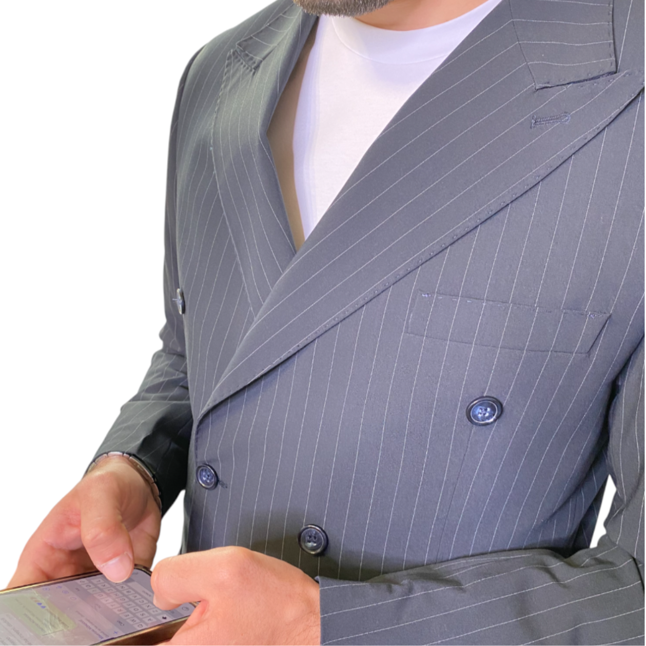 ELIO SANTINI ABITO da uomo rigato composto da giacca doppiopetto con sei bottoni, tasche laterali con patta e pantalone classico, dalla linea dritta con tasche a filo, chiusura laterale con zip e bottone. Disponibile in blu scuro e in nero.