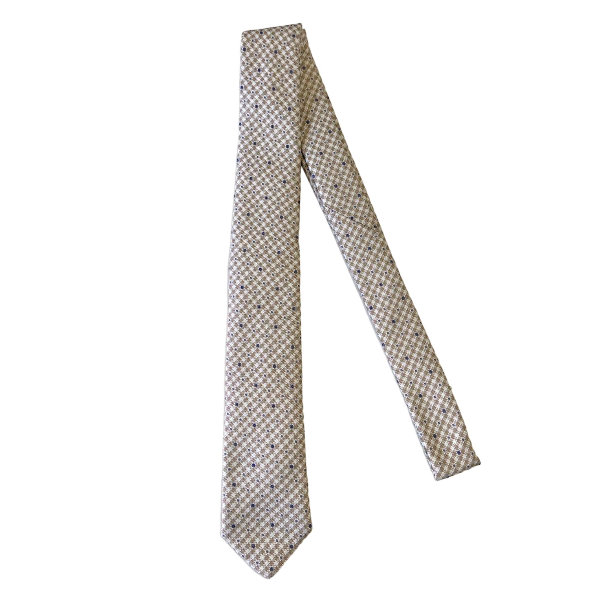 OFFICINA 36 CRAVATTA slim realizzata con materiali di alta qualità. Caratterizzata da un particolare motivo nei toni del beige con dettagli blu, si presenta come un accessorio sofisticato ed eccentrico.