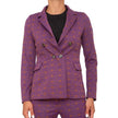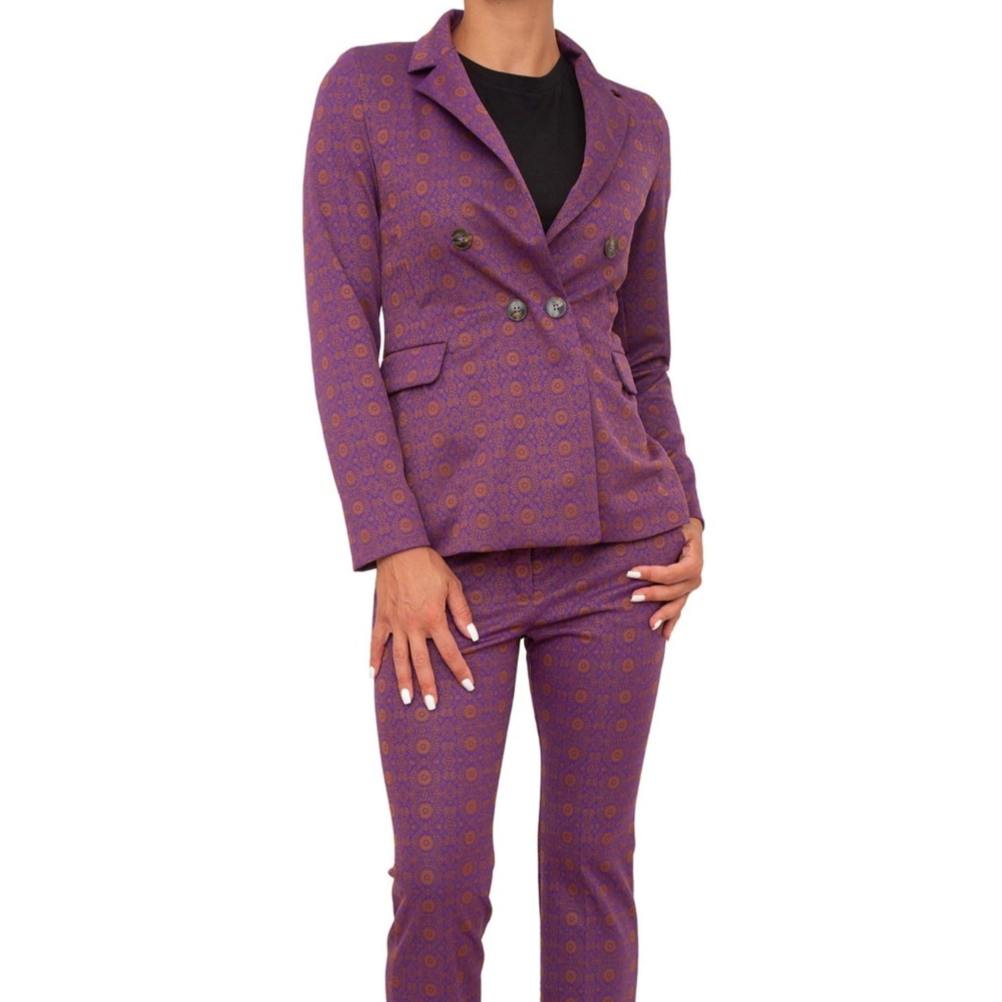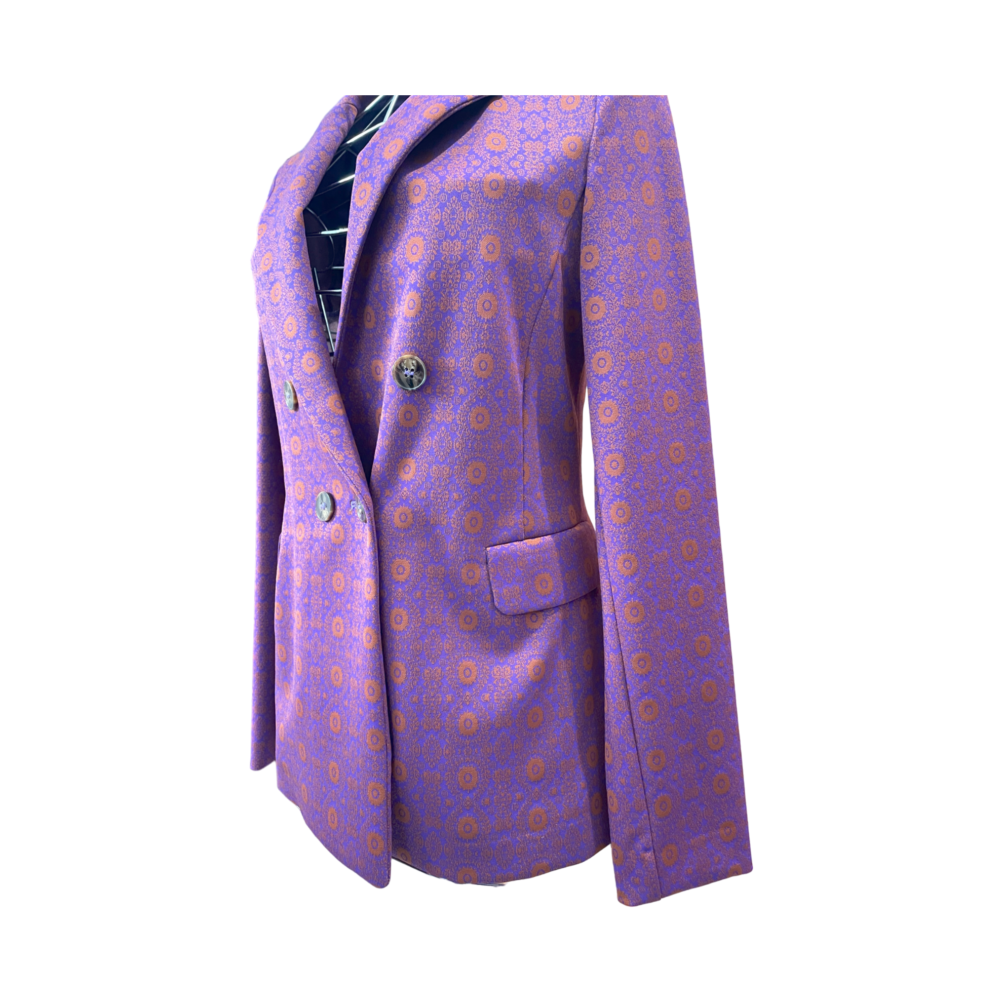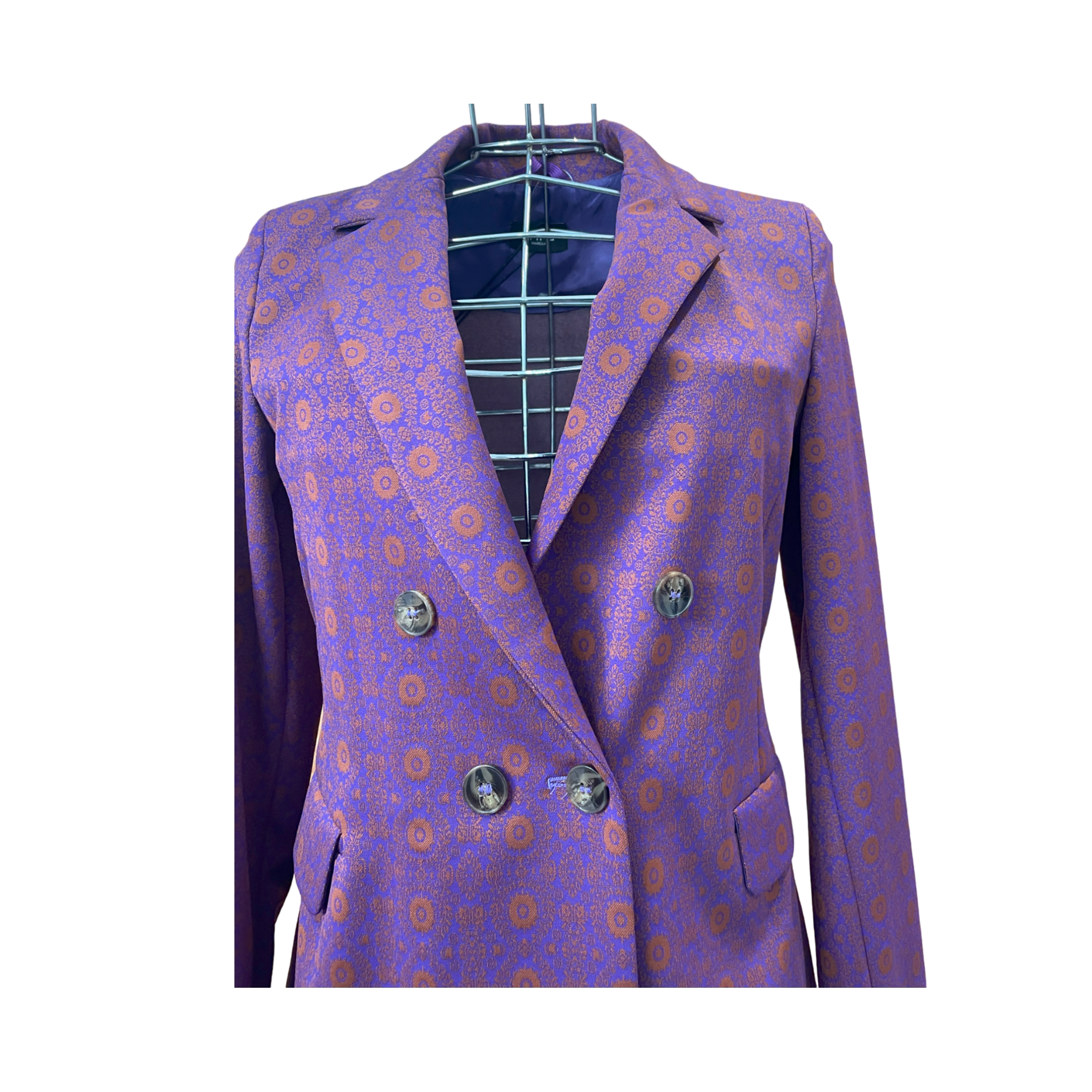 EMME MARELLA GIACCA doppiopetto in un'elegante fantasia viola e arancio. Presenta quattro bottoni e due tasche laterali con patta. Aggiungi un tocco di eleganza al tuo guardaroba invernale.