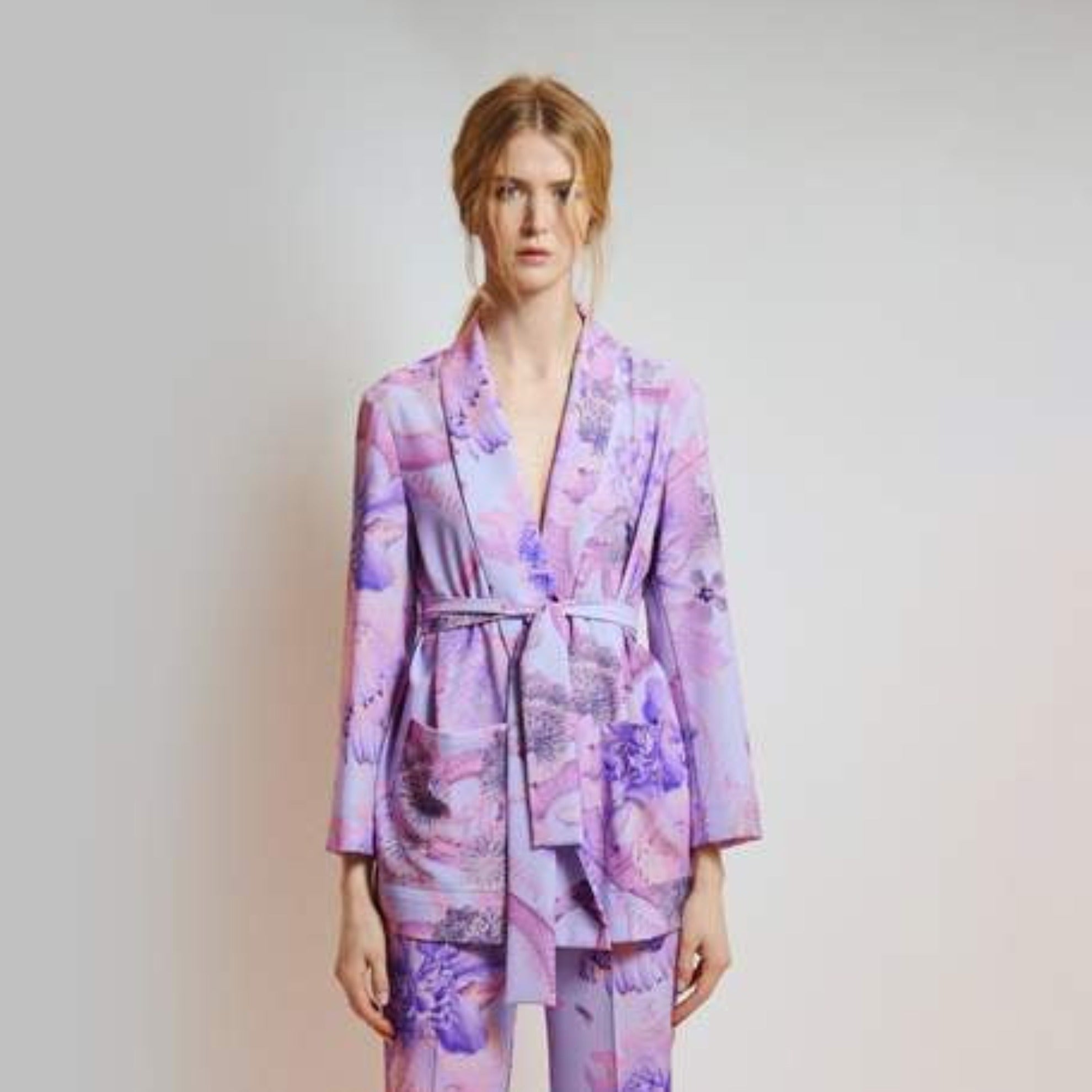 MAESTA GIACCA in crepe, disponibile in una fantasia floreale. Con maniche lunghe, cintura in vita annodabile, tasche laterali e collo a revers. Indossala con il pantalone coordinato e crea un look raffinato e originale.