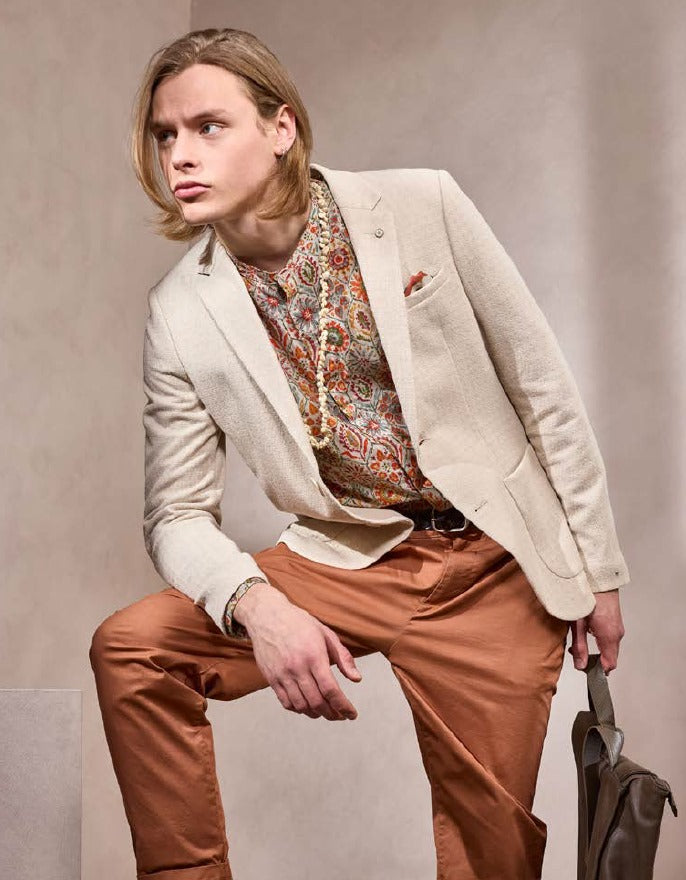 ALTATENSIONE GIACCA da uomo monopetto, in cotone tramato, con ampie tasche laterali e tasca in alto a filo, bottone all'occhiello e vestibilità slim. Fresca e versatile.