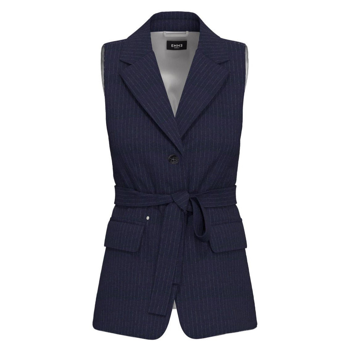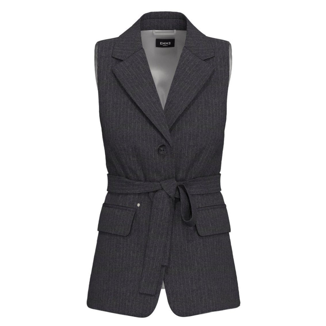 EMME MARELLA GILET gessato due bottoni giro manica con cintura fusciacca a nodo in vita. Perfetto per chi cerca un look elegante e raffinato. Il dettaglio in strass aggiunge un tocco di luce e glamour. Indossalo per un look sofisticato e impeccabile.