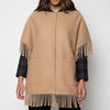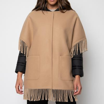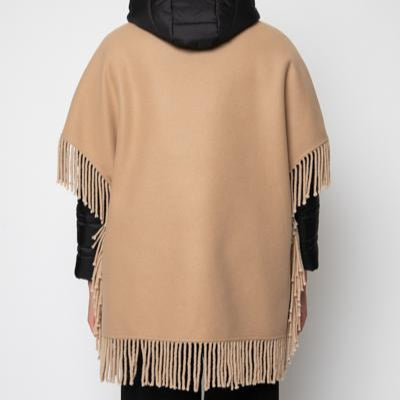 GIULIA VALLI GIUBBOTTO modello poncho con frange ai bordi e maniche in piumino di colore nero a contrasto, per un look unico e audace che unisce il calore del piumino alla leggerezza del poncho con dettagli boho-chic.