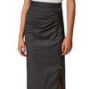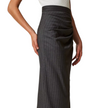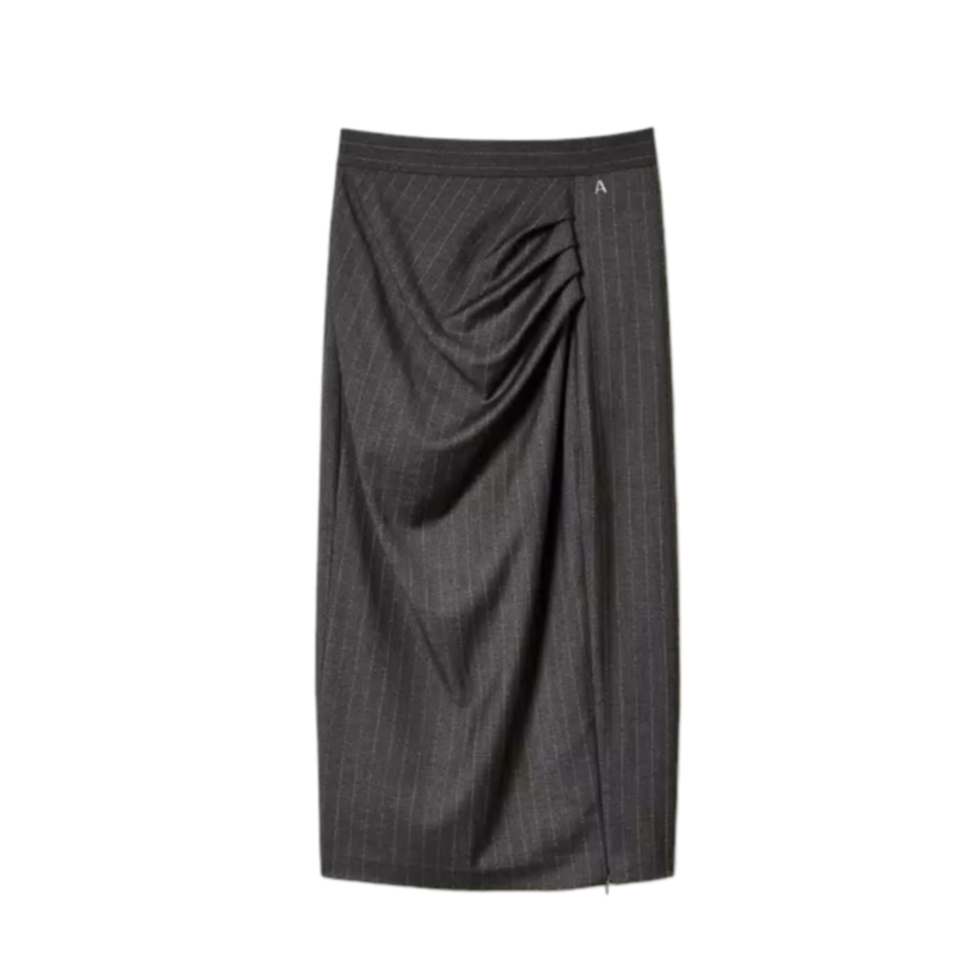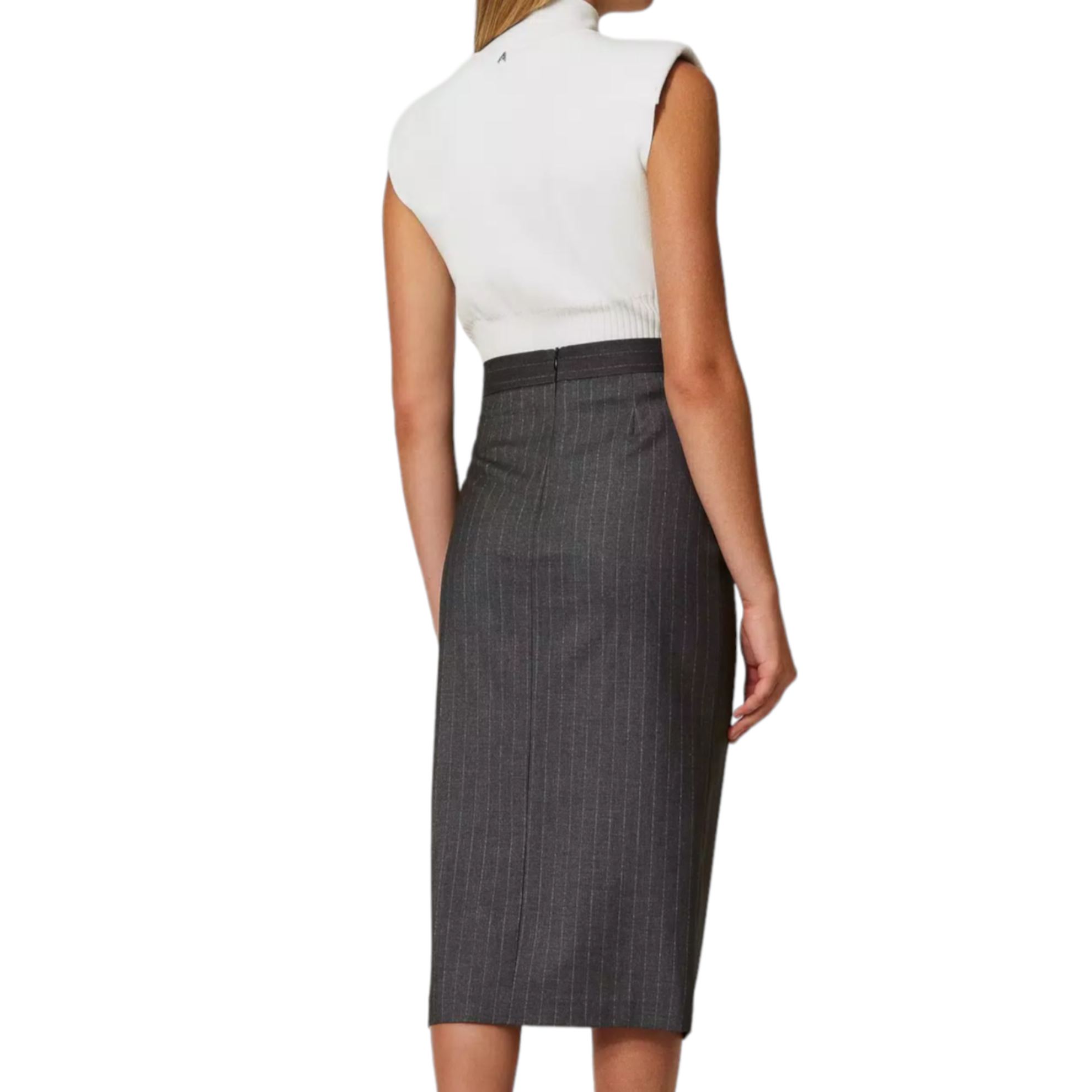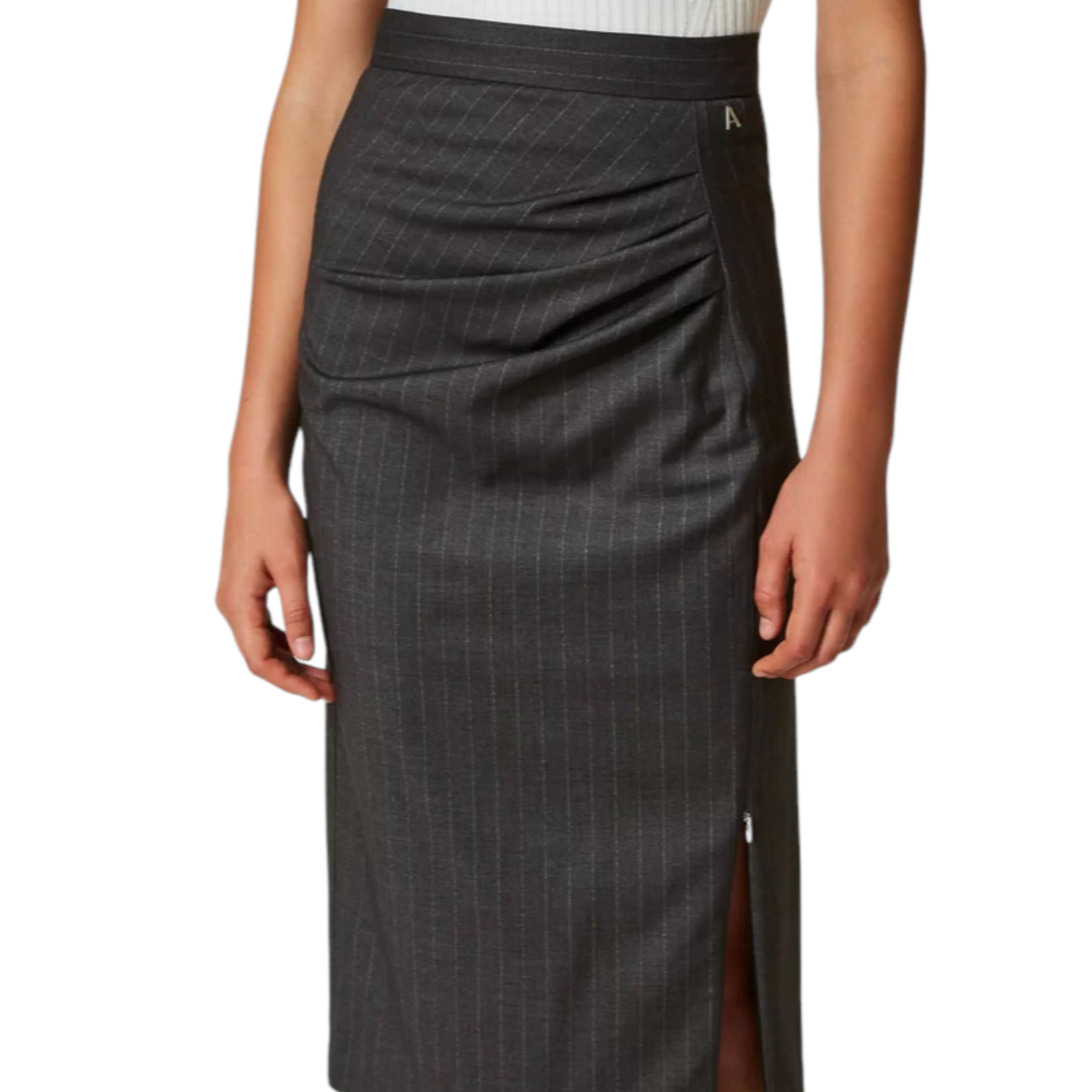 TWINSET ACTITUDE GONNA sartoriale, longuette in tinto filo gessato con drappeggio asimmetrico, spacco laterale apribile con zip e chiusura con zip sul retro. Lunga fino alle ginocchia, è perfetta se abbinata al nostro top coordinato e al cinturone in vita. Da indossare sia per un look da giorno che serale.