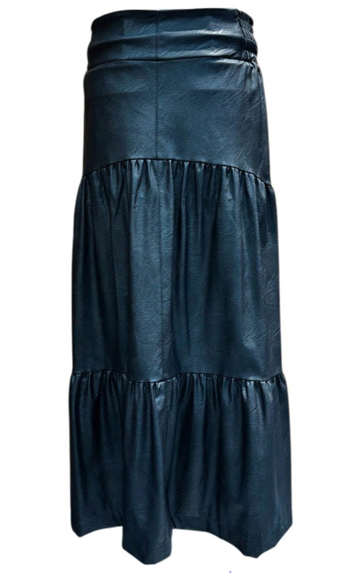 NO-NA' gonna lunga con elastico in vita, modello ampio e alto in vita. Realizzata con un tessuto in eco pelle con cuciture a fascia larga e leggeri drappeggi
