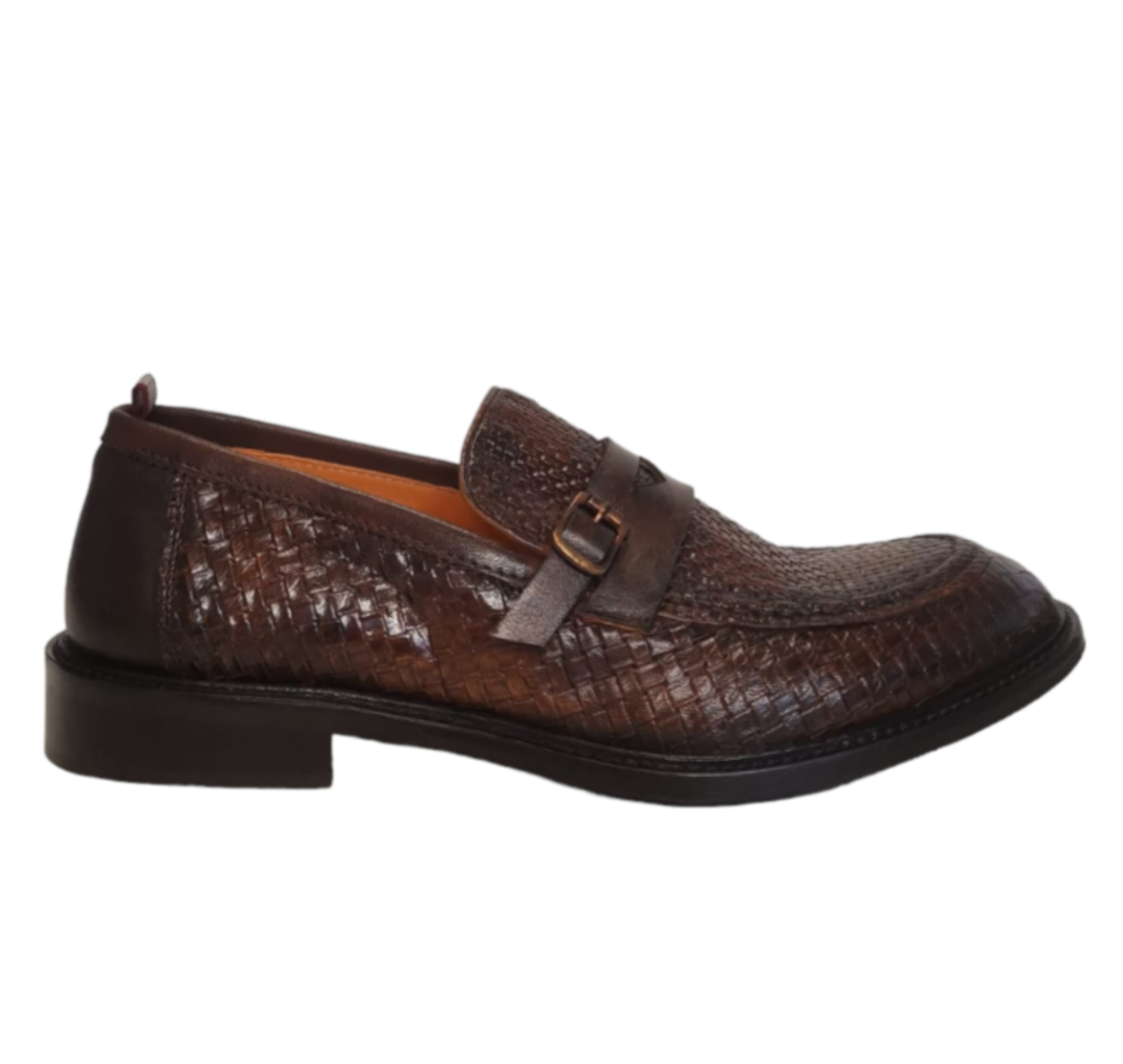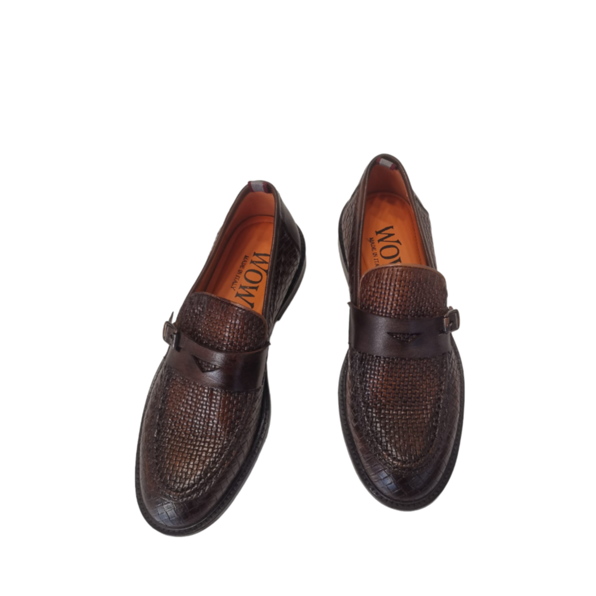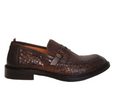 WOW MOCASSINO in pelle intrecciata uomo color cuoio, fondo vero cuoio con inserti antiscivolo, con una particolare fibbietta sula tomaia.