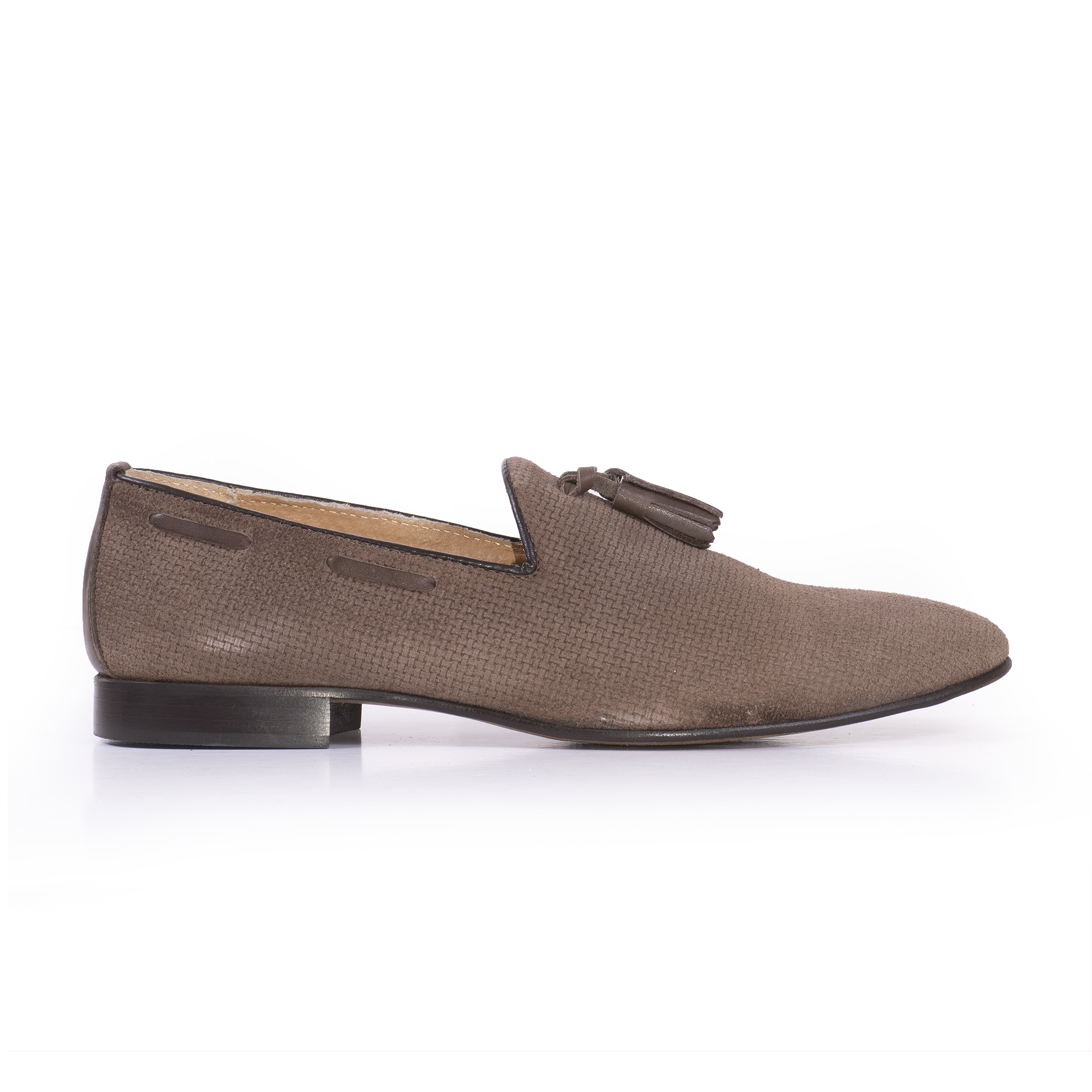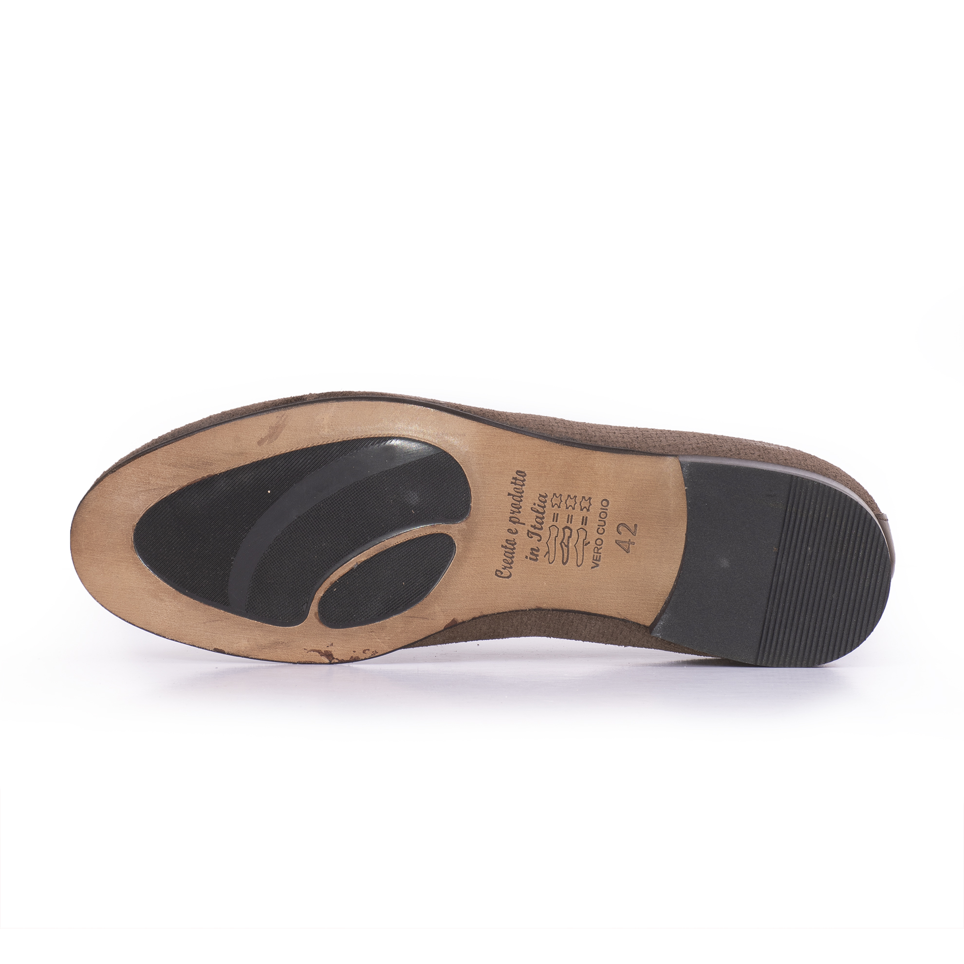 VDC MOCASSINO uomo in pelle scamosciata traforata con nappina sulla patta, con suola in vero cuoio.