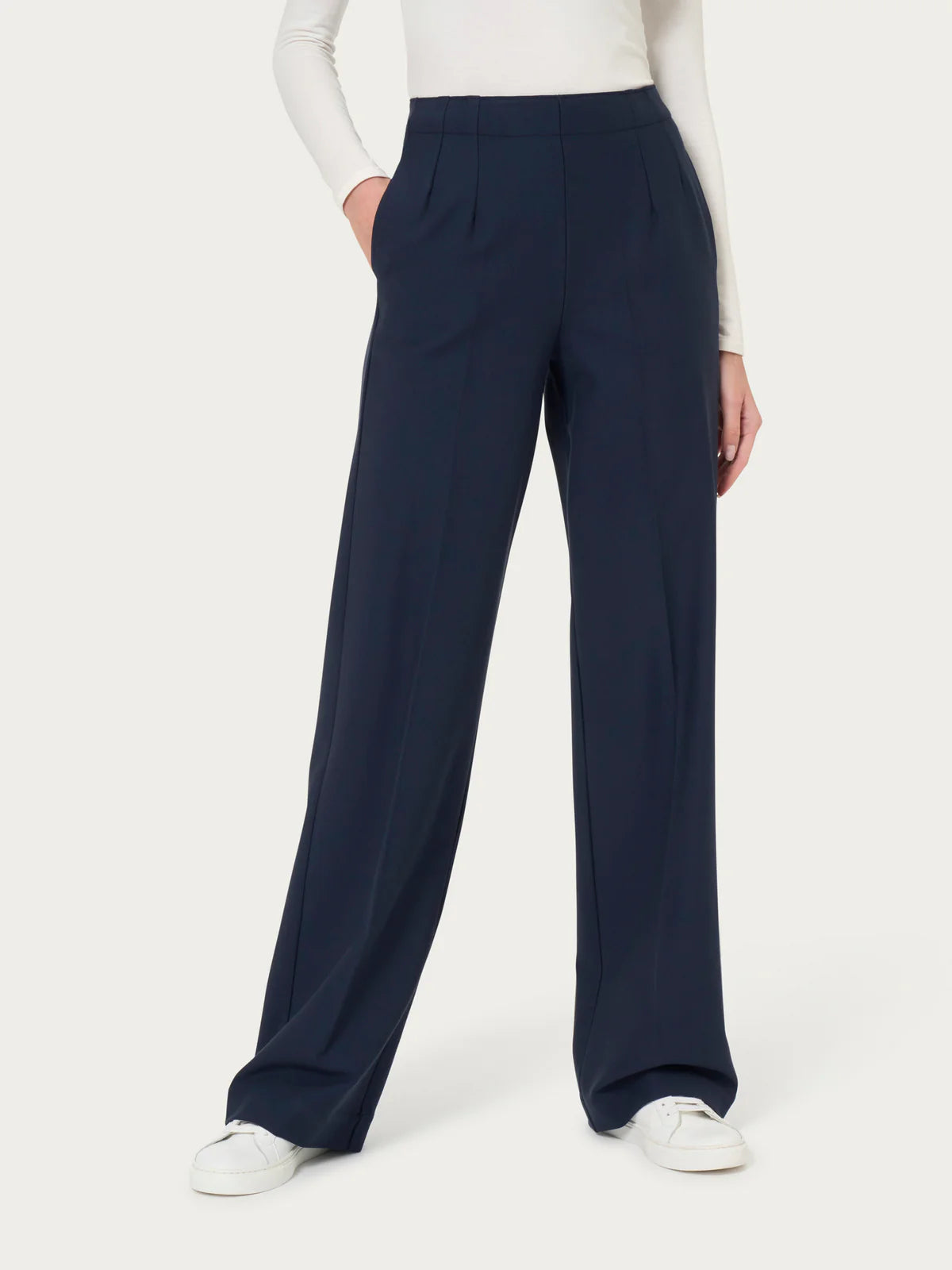 RAGNO PANTALONE a vita alta modello a palazzo con risvolto. Pantalone da donna con vestibilità ampia e rilassata. Questo modello è costruito con vita elasticizzata senza passanti, ma con delicate pinces per una maggiore eleganza. Con pratiche tasche laterali è comodo come indossare un leggings pur mantenendo l'eleganza di un pantalone. Realizzato nell'esclusivo tessuto Compact, un punto Milano incredibilmente compatto ed elasticizzato, tanto da garantire sempre una vestibilità perfetta. Un pantalone ingualcibile e resistente, praticamente indistruttibile e ovviamente lavabile in lavatrice per la massima praticità.
