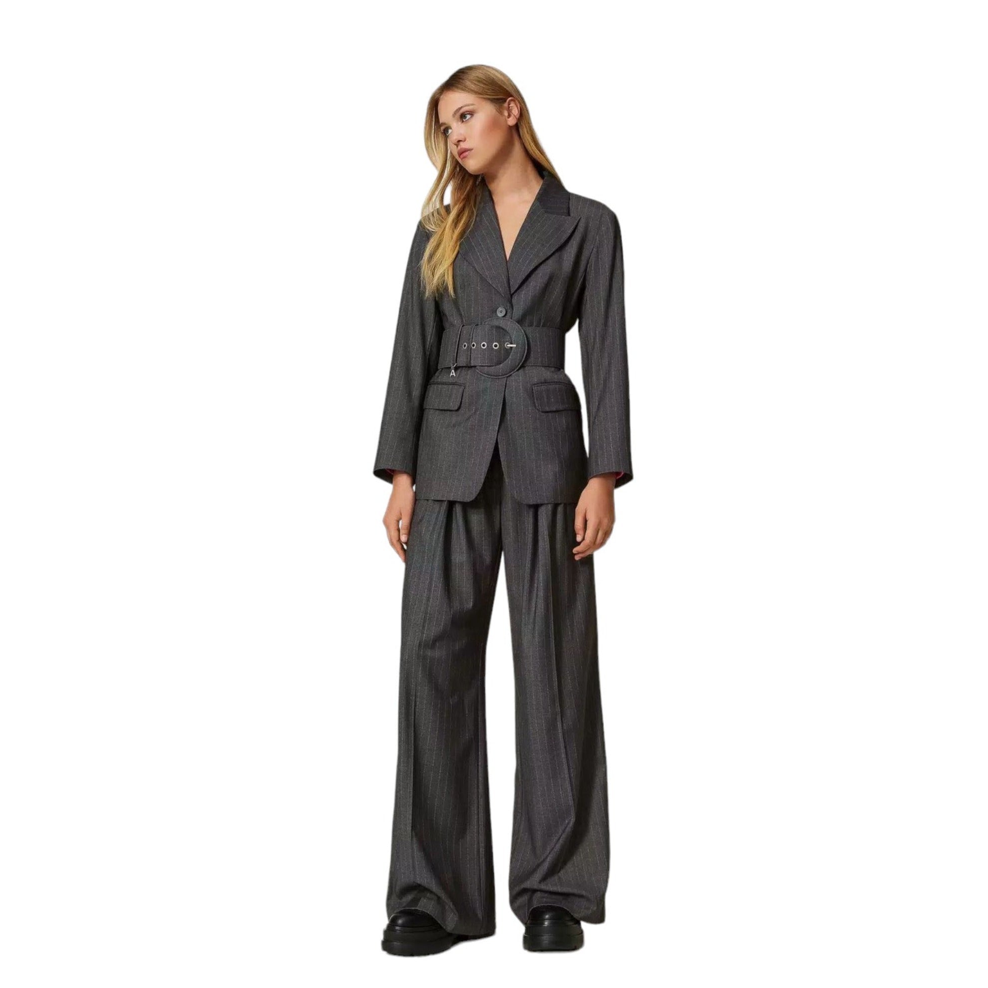 ACTITUDE TWINSET PANTALONE a palazzo disponibile in un colore grigio gessato. Comodo e sofisticato, abbinalo alla giacca coordinata per creare un look alla moda. Perfetti da indossare con una scarpa bassa per un look casual oppure con un dècolletè per un evento importante.