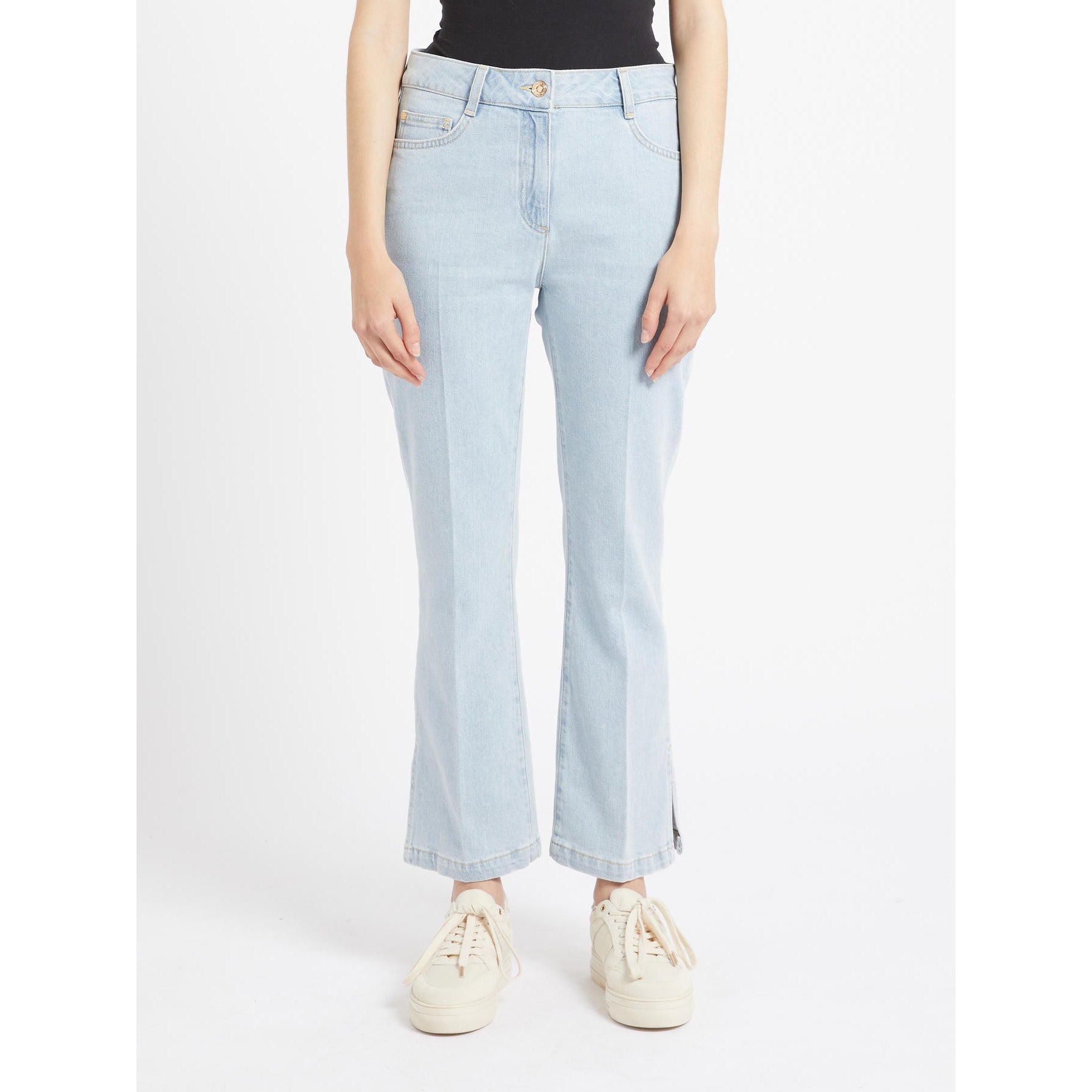 PENNYBLACK PANTALONE modello jeans mini-flare fit in denim comfort. Presenta una silhouette scattante, slim fino al ginocchio e leggermente svasata al fondo, con spacchetti laterali e lunghezza alla caviglia. Design cinque tasche, vita media e zip nascosta. Abbinalo ad una sneakers per un look sportivo.