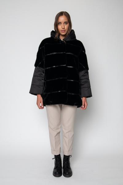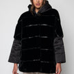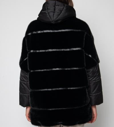 GIULIA VALLI ECO PELLICCIA modello 3/4 con cappuccio e chiusura con bottoni. Maniche e cappuccio a contrasto in piumino