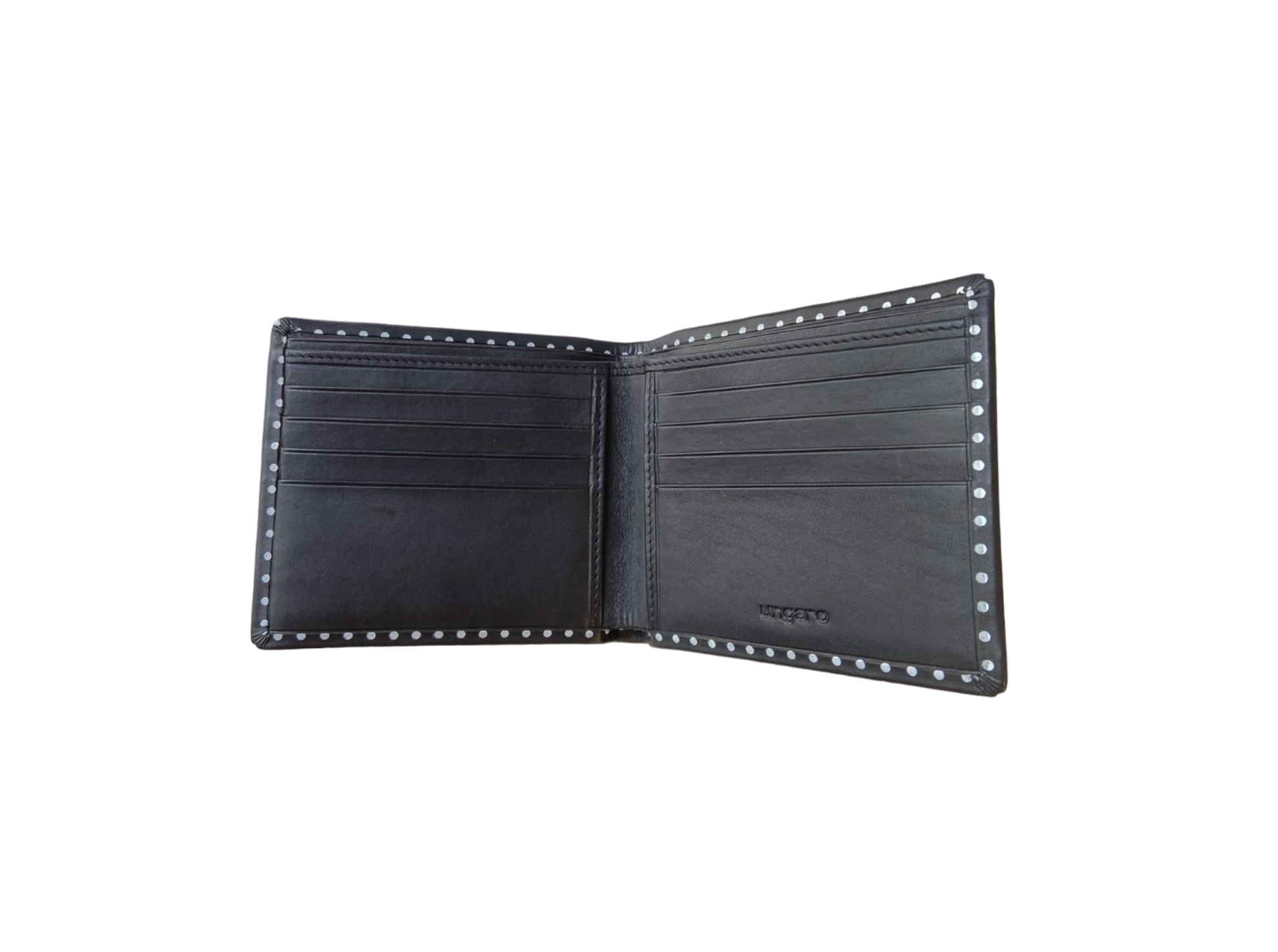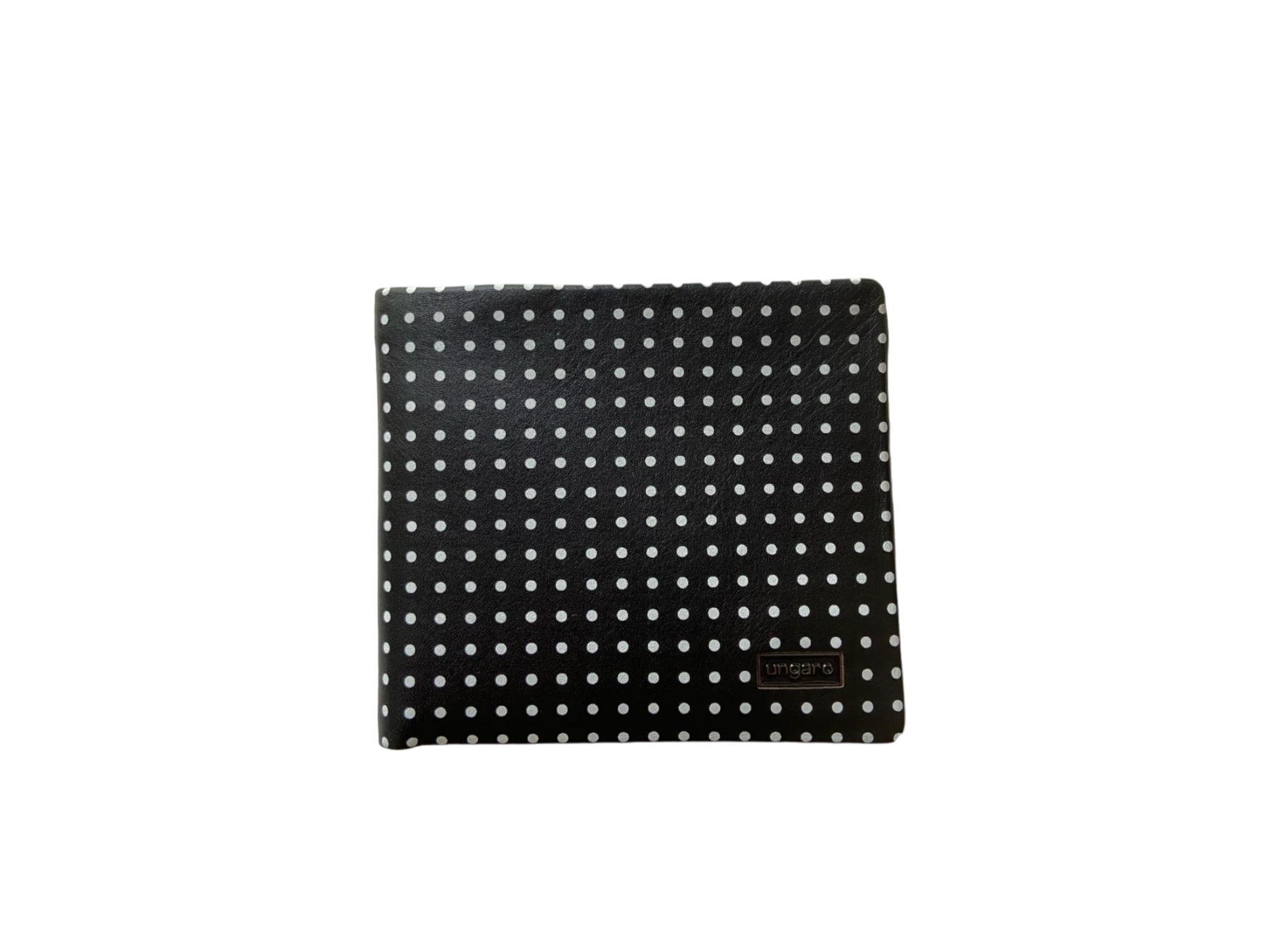 UNGARO PORTAFOGLIO in ecopelle nero con pois bianchi. Presenta un design quadrato, diversi slot per carte e uno spazioso scomparto per banconote per facilitare l'organizzazione delle tue finanze.