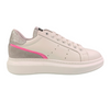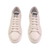 APNEA SNEAKERS in pelle bianca con dettagli scamosciati in grigio e rosa e in argento satinato. Provviste di lacci e di una doppia suola bianca, rappresentano il giusto connubio tra comfort e stile. Indossale di giorno con un jeans e fai una dichiarazione di moda