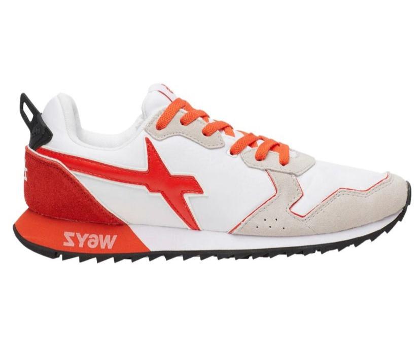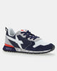 Sneakers in tessuto tecnico, con dettagli a contrasto fra loro. Chiusura con lacci e plantare estraibile. Suola in gomma. Logo stampato su uno dei lati che funge da contrasto dal fondo blu.