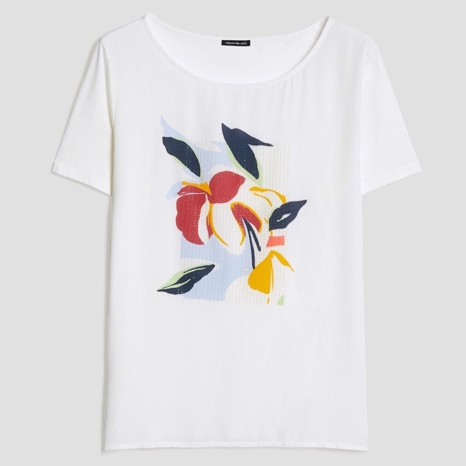 PENNYBLACK T-SHIRT arricchita da stampe con micro-strass sul davanti in crêpe de Chine aggiunge un tocco di eleganza agli outfit quotidiani. Realizzata in jersey di viscosa stretch, presenta linee diritte e morbide, con scollo a barchetta arrotondato e maniche corte. Gli spacchetti laterali al fondo completano il design, rendendola un capo versatile e luminoso.