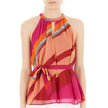 PENNYBLACK TOP Halterneck in Georgette con il suo taglio all'americana e le linee svasate evoca uno stile chic ispirato agli anni '60. La leggera arricciatura al girocollo e il dettaglio cut-out sul davanti aggiungono un tocco di eleganza, mentre l'apertura a goccia sul retro completa il look. La cintura coordinata da annodare in vita enfatizza la silhouette. Foderato e realizzato in poliestere riciclato, è un capo che unisce stile e sostenibilità.