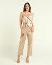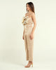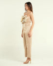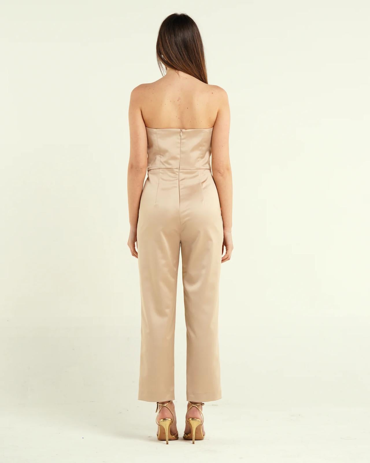 NIKAMO TUTA aderente senza bretelle in douchesse stretch con ampio fiocco in jacquard lurex sul top, pantalone ampio, zip sul retro.